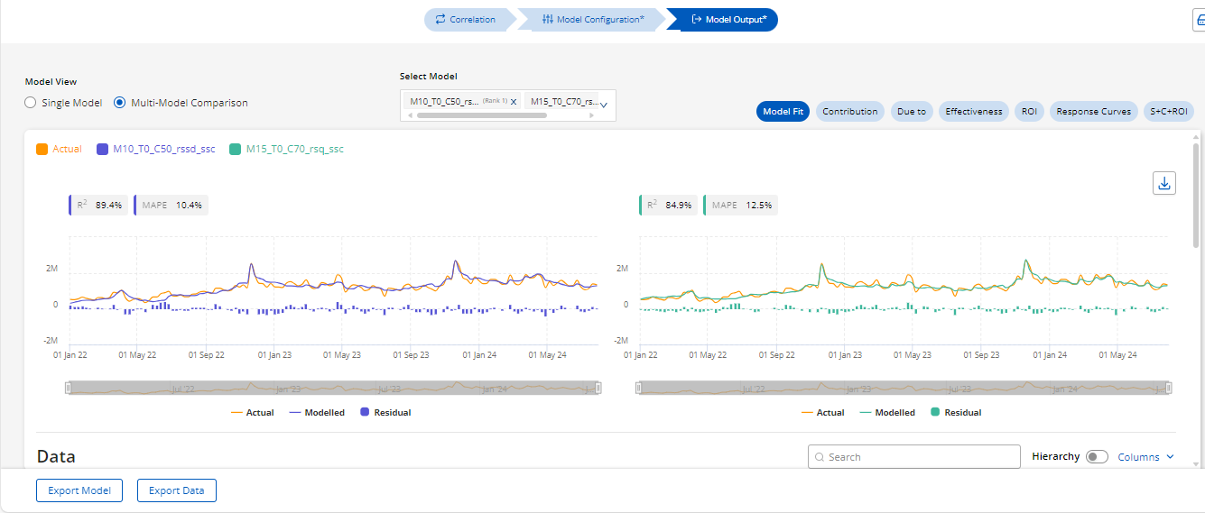 The Dashboard View provides a comprehensive visualization of model outputs through various charts and interactive elements. It offers insights into model fit, variable contributions, response curves, ROI, Due-To chart, effectiveness, and spend vs. contribution with ROI.