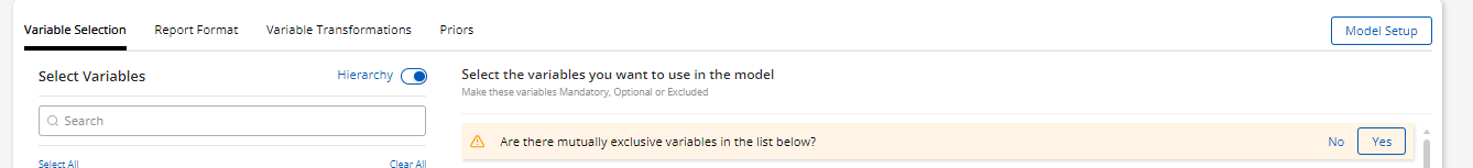 Once all the variables are selected, user will be notified if there are any mutually exclusive variables, if yes then user needs to click on Yes which navigates the user from variable selection page to mutually exclusive page.