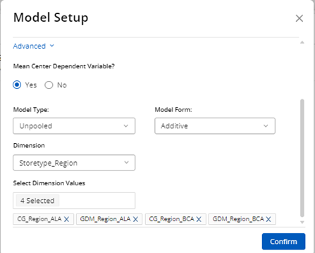 Model Configuration: The summary will show co-efficients, transformations, absolute contributions, percentage contributions for each variable in an expanded view, User an option to collapse each of these for better view.