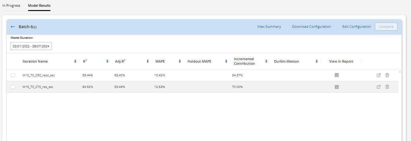 From the list view, user will be able to compare two models of different batches as well (refer to the image below),