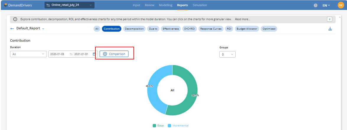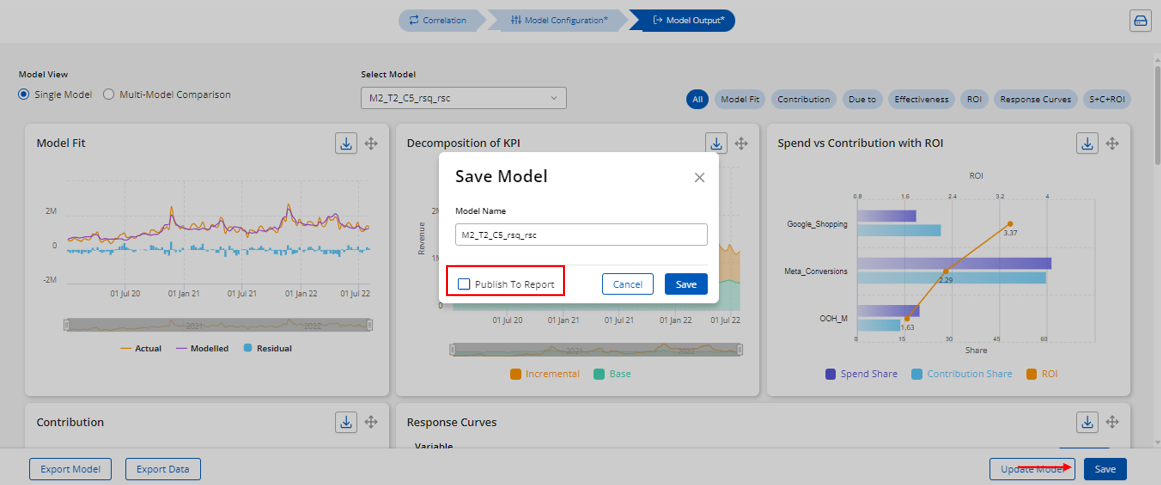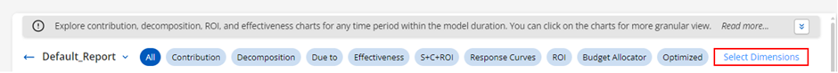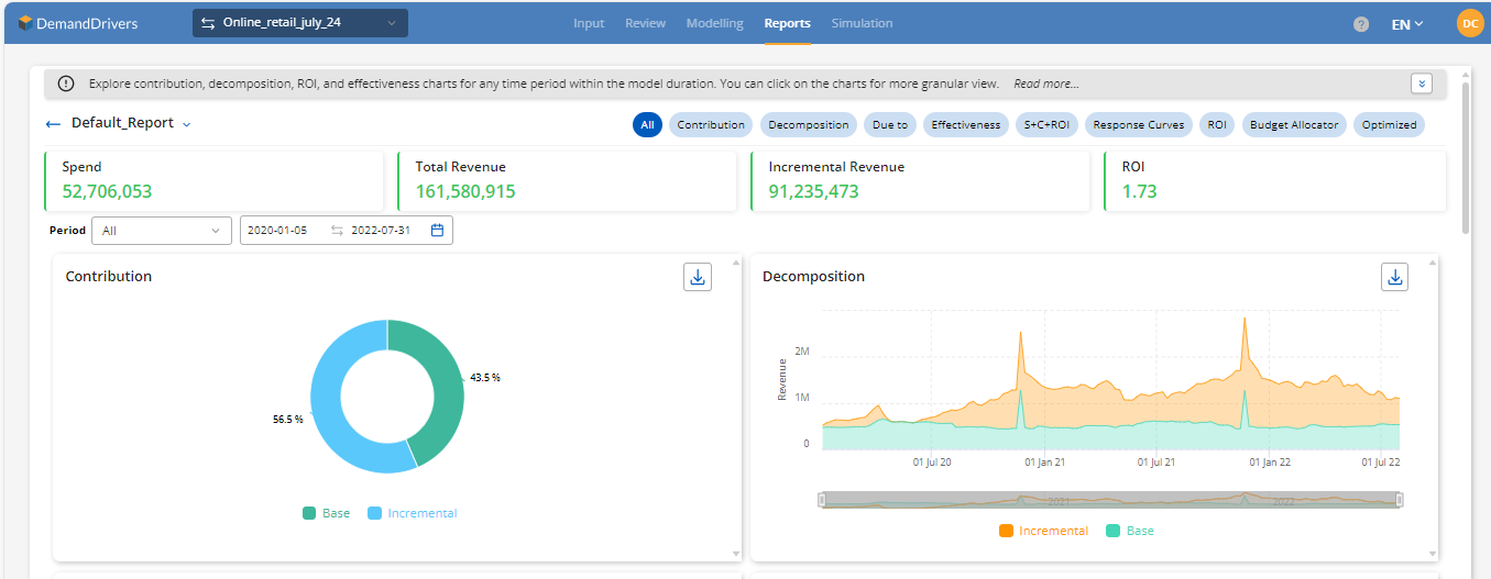 The Report Module serves as a comprehensive tool for reviewing and analyzing the outputs from the Modeling Module. It enables users to delve into various analytical charts, including contribution, decomposition, ROI, spend vs contribution with ROI, Due-to, response curves and effectiveness for the model duration. Users can interact with these charts to gain more detailed insights by clicking on specific areas for a granular view.