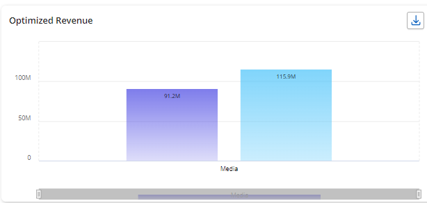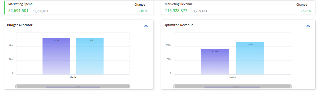 Optimized Revenue/ KPI - This chart displays the optimized Revenue/KPI after budget optimization is run. Once the optimized spend is applied, the corresponding Revenue/KPI is recalculated and shown in the chart. It highlights the difference between the initial and optimized values, demonstrating the impact of the budget reallocation process.