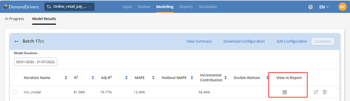 a) By clicking on 'View in Report' from Batch page.b) By clicking on 'Save' from model output page, a popup appears where user has an option to publish the model to the report by selecting 'Publish to Report' option.![]()