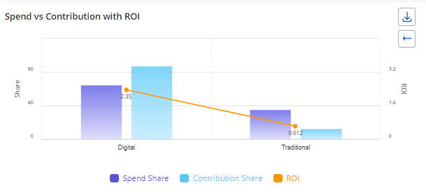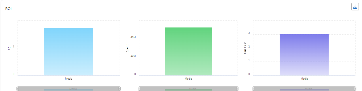 ROI - The chart displays the ROI for media variables while also illustrating the amount spent during the same period and the associated media costs that contributed to achieving that ROI for media variables.