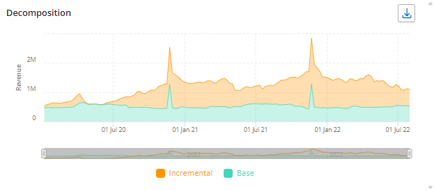 2. Decomposition - It allows the user to view a trend or area-chart depiction of how the individual variable contributions have varied on a daily, weekly or monthly basis. There is an option to export the decomposition data on the chart.