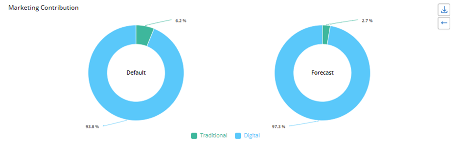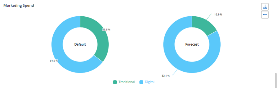 The default scenario displays the original media allocation amounts before any optimization, based on session duration and its settings. The forecast scenario shows the optimized values after applying the simulation with defined constraints.