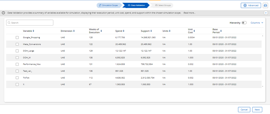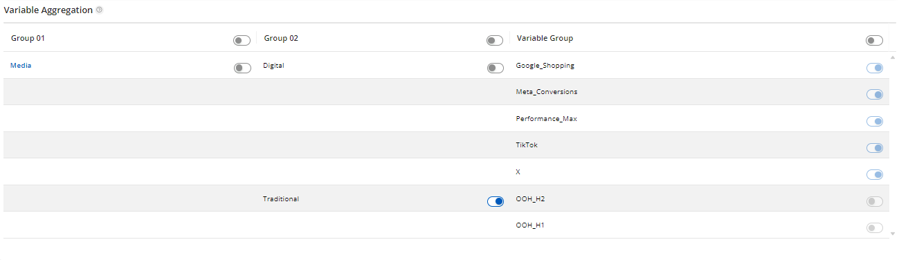 Users can select different levels to simulate. For instance, they might choose to simulate Digital at group 3 or variable group that is at “Google_Shopping”, “Meta_Conversions”, “Performance_Max”, “TikTok” and “X” and simulate "OOH_H1" and ”OOH_H2” at Group 2, that is at Traditional without including its group 3 components.