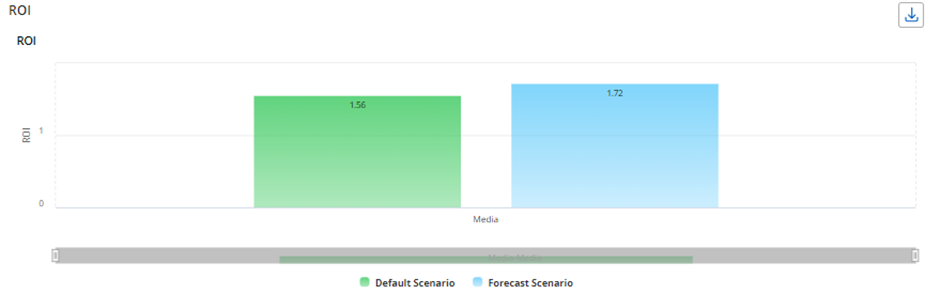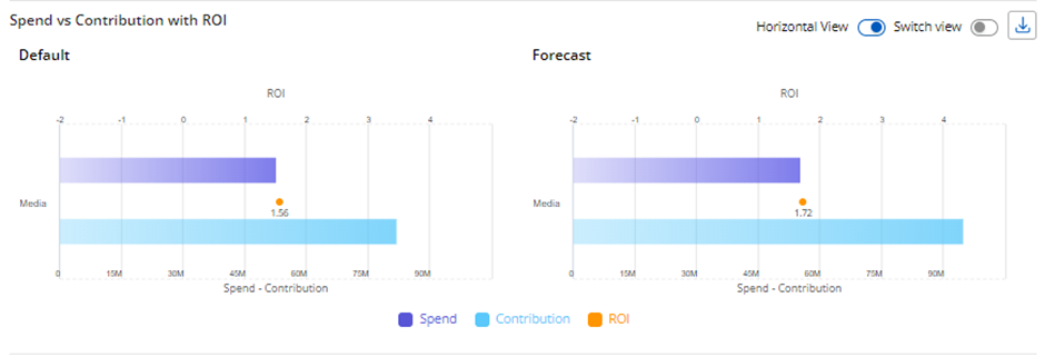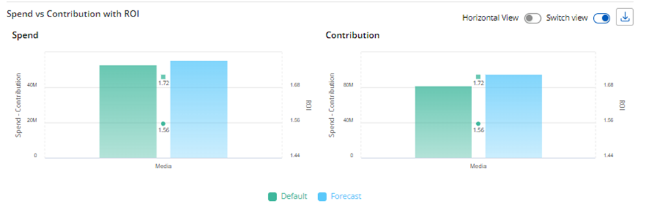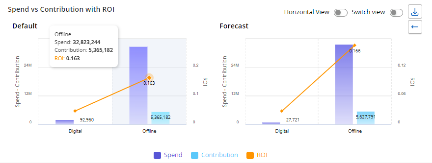 Switch view – In both the initial and horizontal views, the chart shows Spend, Contribution, and ROI for the Default and Forecast scenarios, using these metrics as legends. When the user selects Switch View, the chart updates to display Spend and Contribution as separate charts, while the Default and Forecast scenarios are represented as legends in the same chart for both spend and contribution.