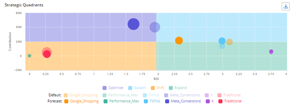 This visualization helps in determining the strategic focus for each tactic based on its contribution and ROI.